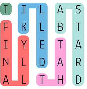 Place the scrambled words into the 5x5 grid. Read the first line from the top down and second line from the bottom up, and you'll see the sentence: I FINALLY KILLED THAT BASTARD